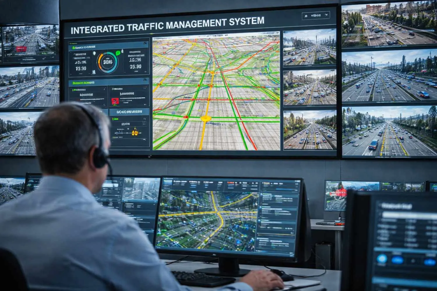 An Integrated Traffic Management System collects live data from multiple sources across the city. Sensors and cameras continuously track vehicle flow, speed, and congestion levels.